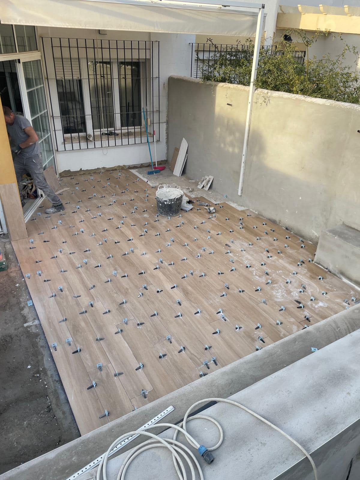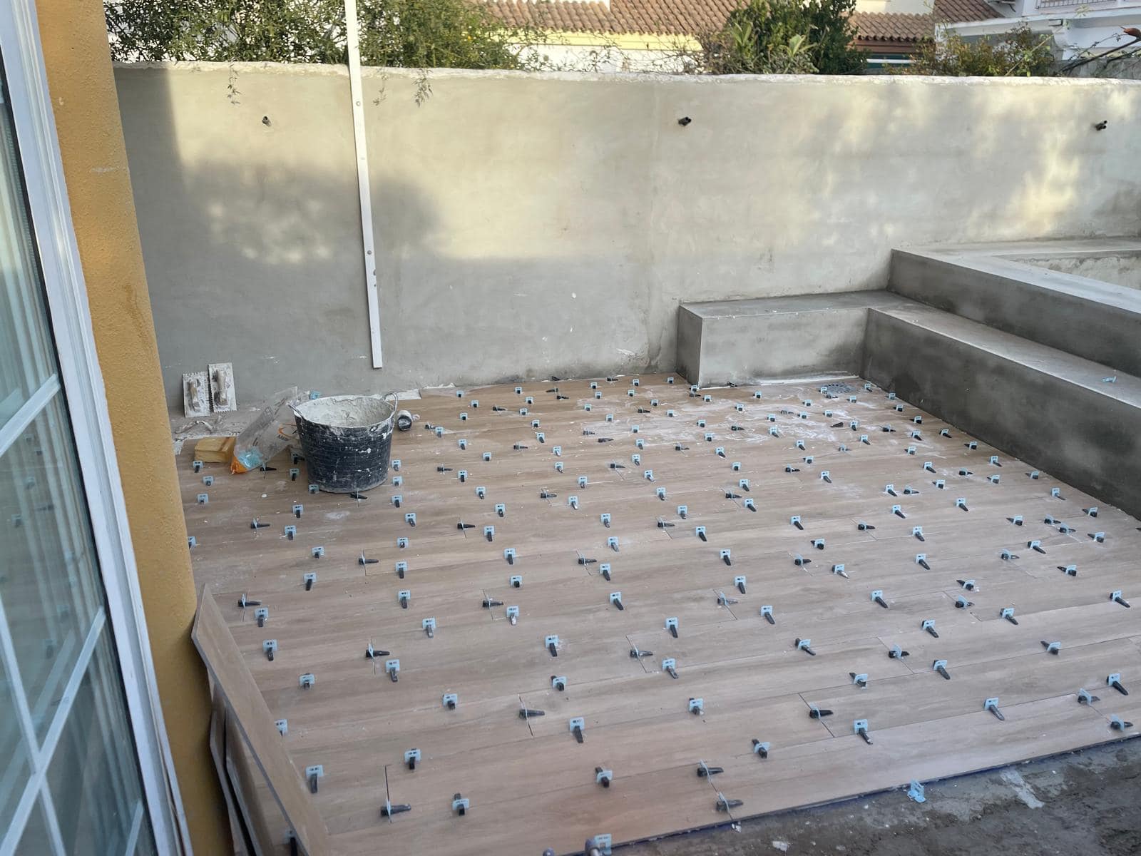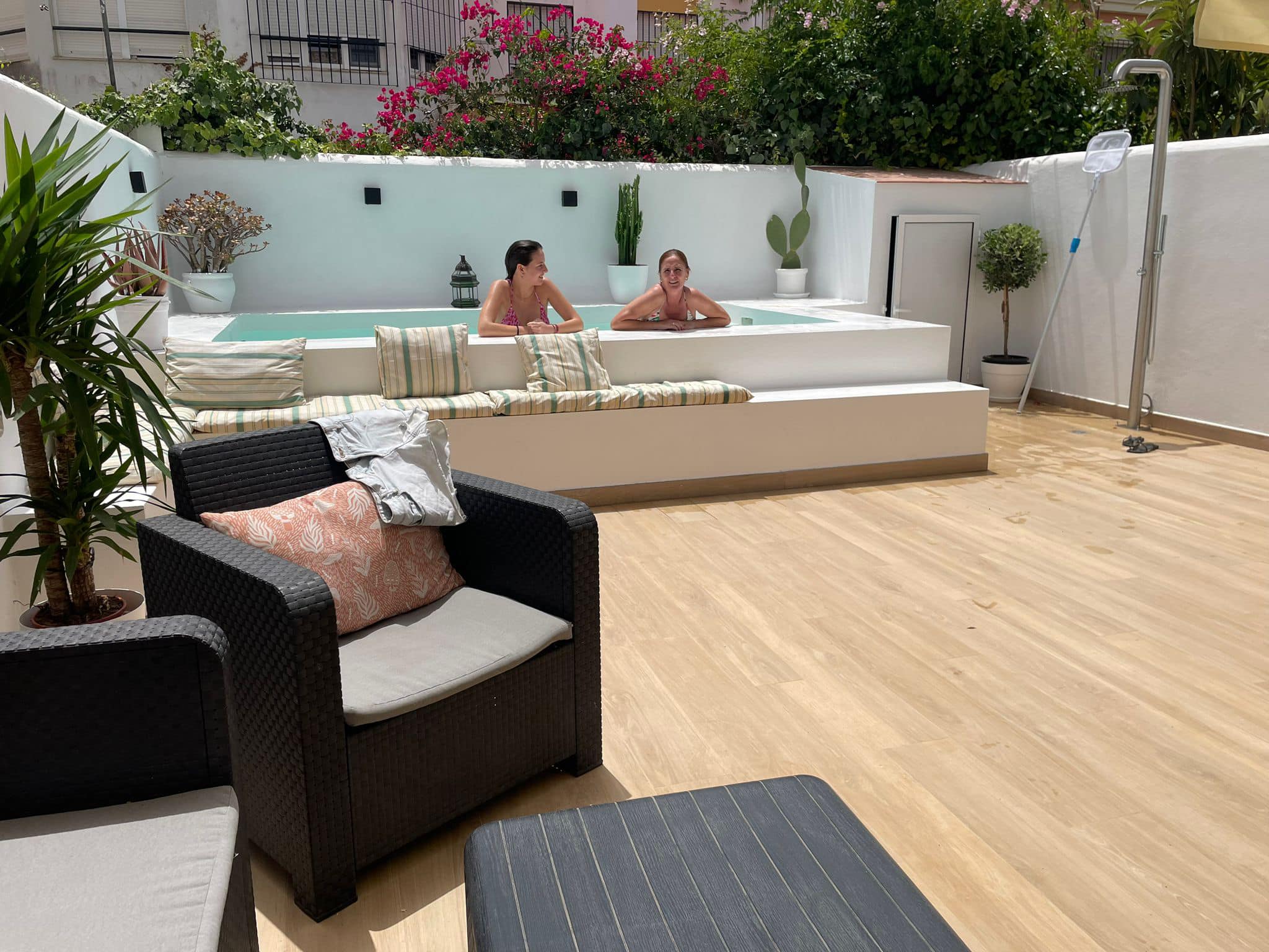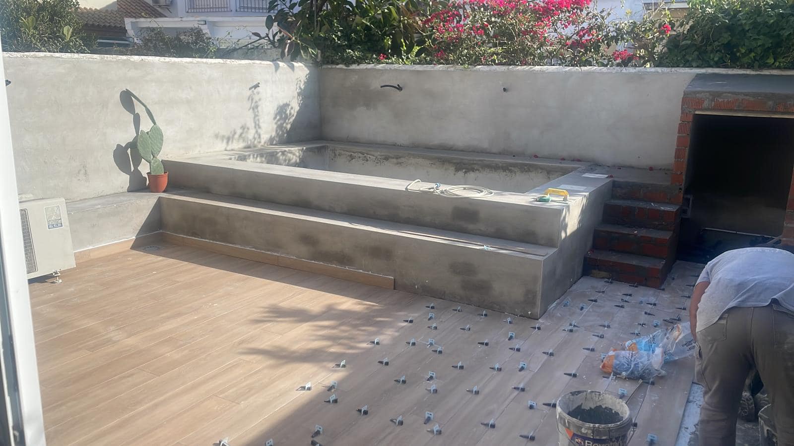 Preparación completa de patio con suelo de parquet , piscina , depuradora y toda la decoracion